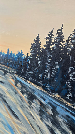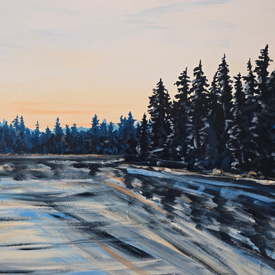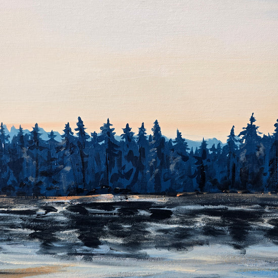 "Day at the Lake" captures the serene beauty of an early morning, where nature awakens under a soft golden glow. The painting features shimmering hues of blues layered with heavy strokes of acrylics, creating depth reminiscent of still water. Gentle textures suggest the ripples of the lake, while warm light dances across its surface, reflecting the first rays of dawn. The interplay of soft tones and dynamic movement evokes a sense of tranquility, inviting the viewer to pause and immerse themselves in the peaceful embrace of nature’s quiet moments.