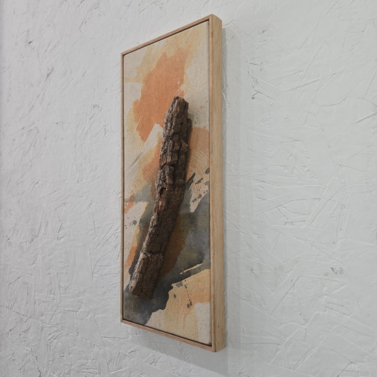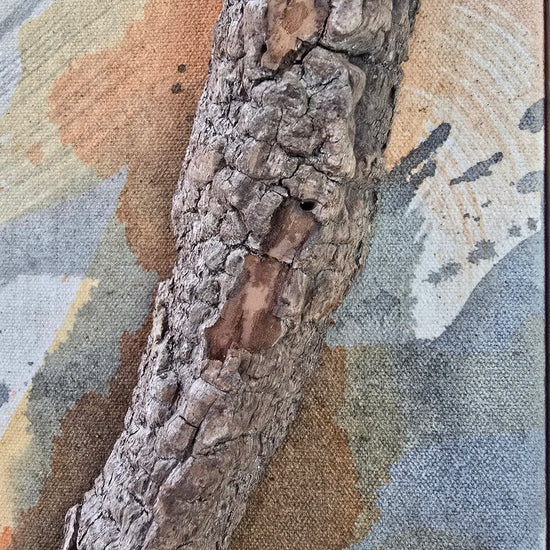 "Natural State Series" 7.5w x 18h x 3 " 3D mixed media using inks, acrylics, found natural bark on raw canvas with oak wood frame.