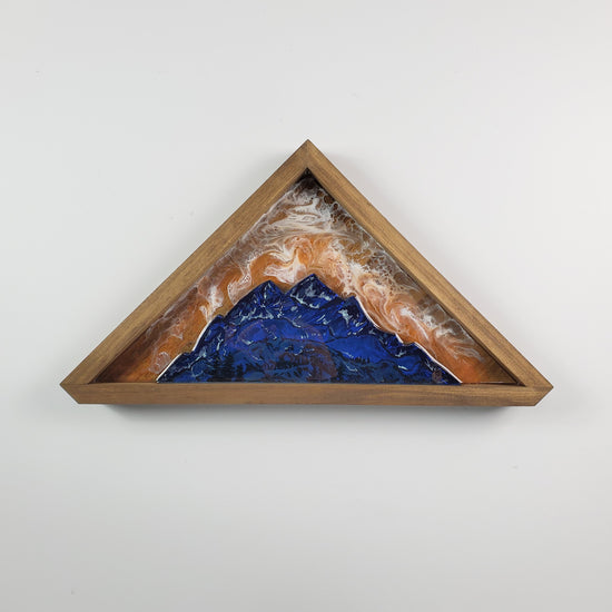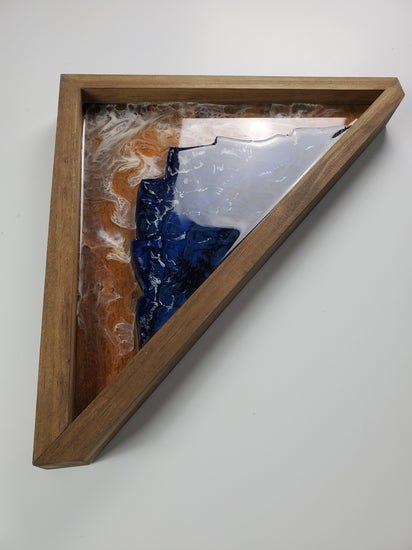 Mixed media: Hand-painted with acrylic on wood. Wood cutout inlay with epoxy art flood coat. Handmade wood frame. Each one is one-off and unique. A great piece that can set on a shelf or hung on the wall. Size: Approximately 19 x 10.25" triangle.