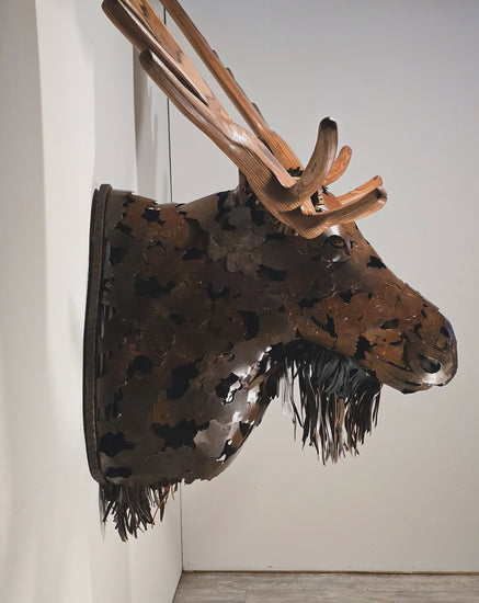 Life size faux taxidermy sculpture welded together from recycled metals. Antlers carved from multiple species of wood with reclaimed leather accents.